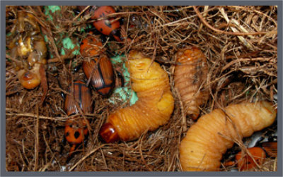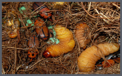 pupas, y, posteriormente, en escarabajos adultos.